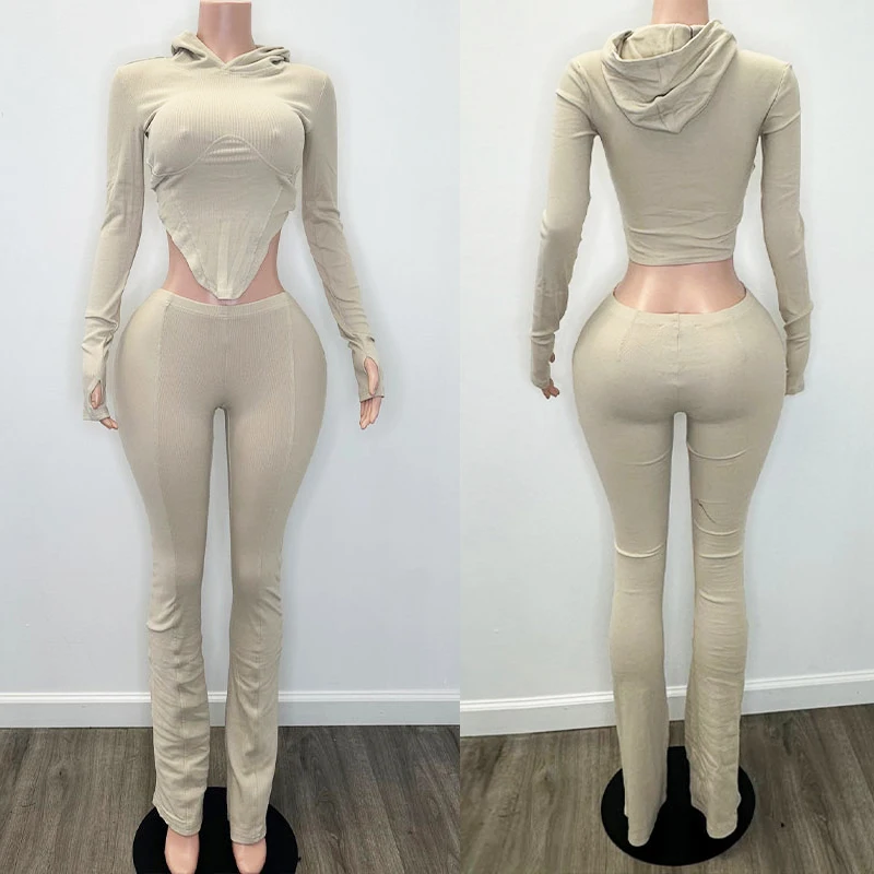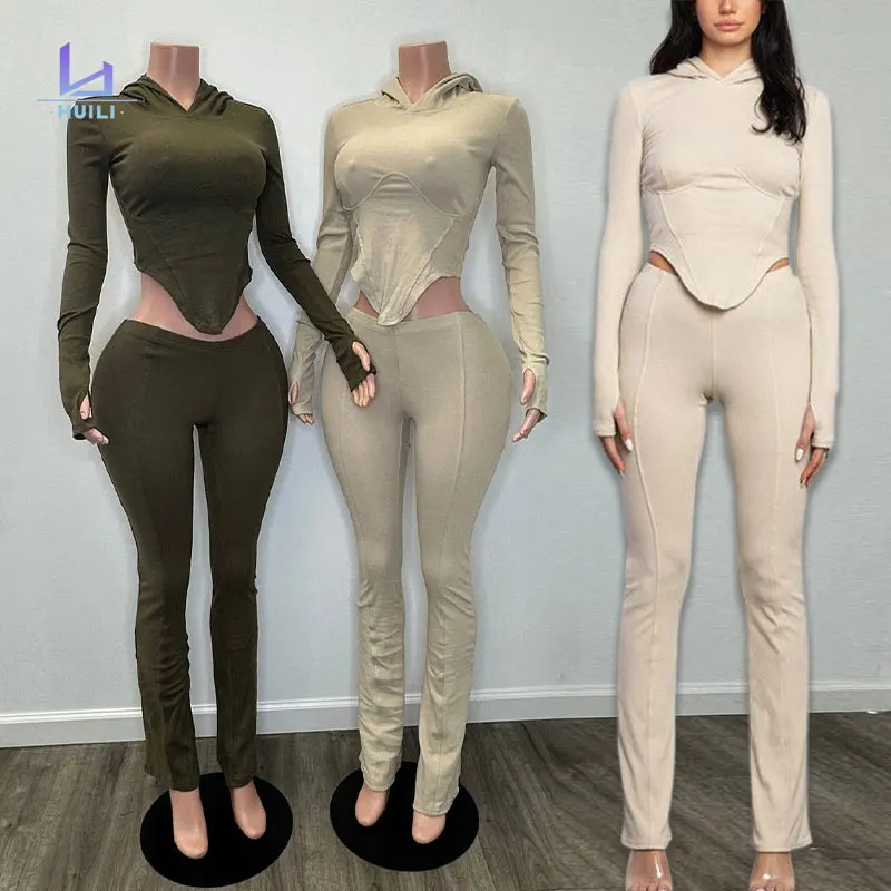 Huili Manufacturer Oem High Quality Hooded Crop Top & Flare Leggings Two Piece Set Clothing Workout Activewear Women's Sets 2025